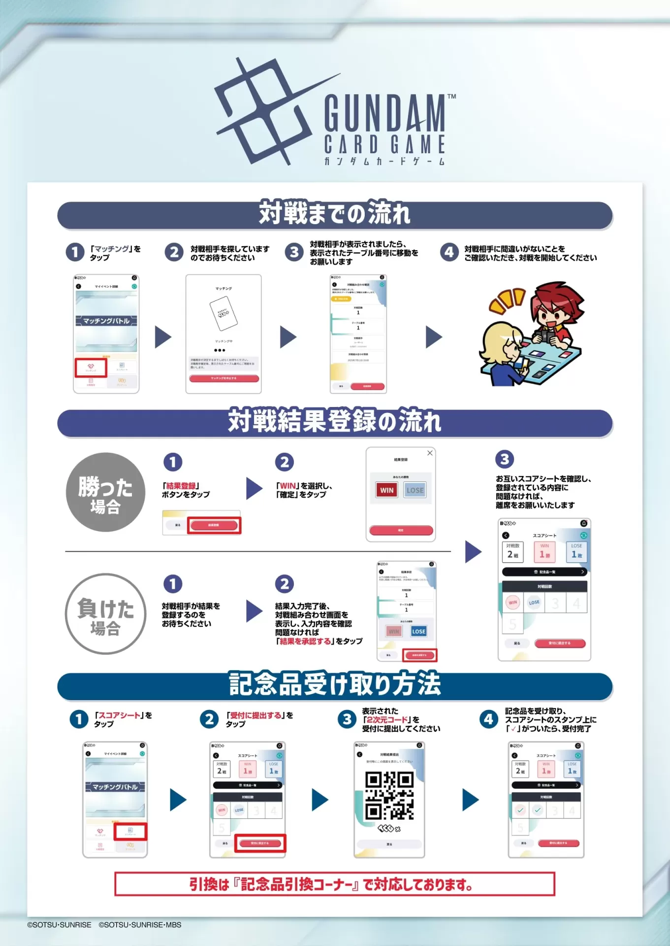 - イベント情報は、アプリ『BANDAI TCG+』にてゲームタイトルを『GUNDAM CARD GAME』に設定することで表示されます。