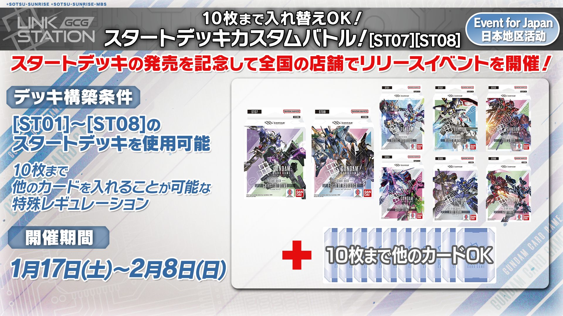 - イベント情報は、アプリ『BANDAI TCG+』にてゲームタイトルを『GUNDAM CARD GAME』に設定することで表示されます。