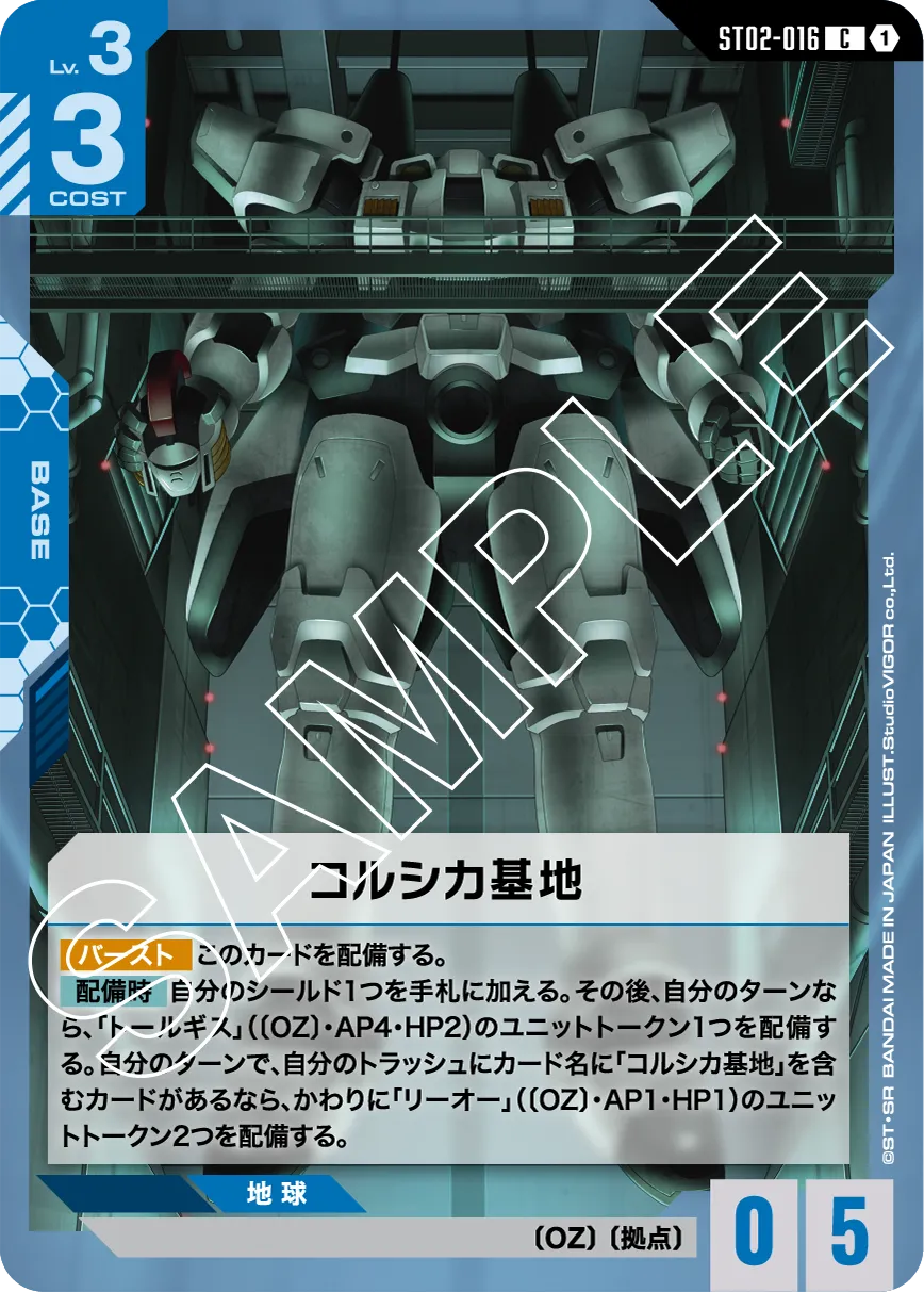 なお、「スタートデッキ Wings of Advance[ST02]」にST02-016 コルシカ基地が3枚含まれておりますが、デッキの内容を一切変更しない場合のみ、公認・公式イベントでも使用することができます。