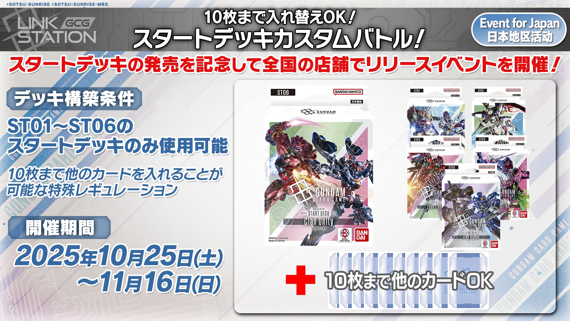 กิจกรรมนี้จะถูกจัดขึ้นตามBANDAI TCG+ ห้างต่างๆ. ซึ่งจะมีรางวัลเข้าร่วมแข่งขัน ดังนี้, "รีซอร์ส" และ "LINK UNIT SET".